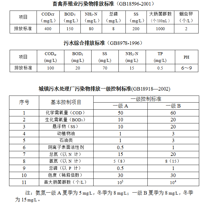 目前养殖废水尚没有统一的排放要求,排放标准多是根据地方部门的要求而确定。目前常见的处理要求有:《畜禽养殖业污染物排放标准》(GB18596-2001)、《污水综合排放标准》(GB8978-1996)、《城镇污水处理厂污染物排放标准》(GB18918—2002)。具体如下: