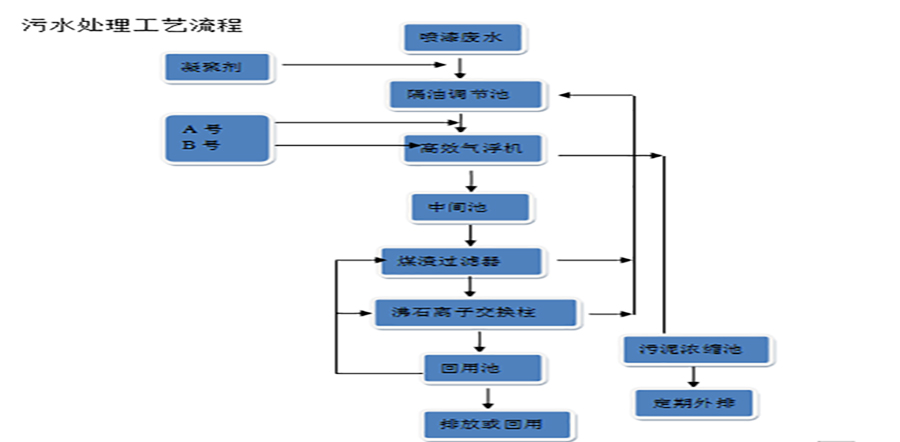 喷漆废水首先加入凝聚剂分解去除油漆粘性同时将水中油漆重金属去除,控制循环水生物活性,使循环不易产生恶臭,同时可降低COD含量。后进入调节池进行均质、调节水量和水质,再经泵提升至气浮装置,在气浮装置投加助凝剂 和絮凝剂,进行固液分离清水流至中间池。浮渣自流至污泥浓缩池,定期外排。