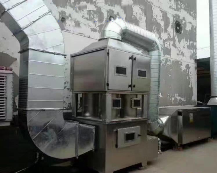 其次:废气经过洗涤塔后进入光解式废气处理设备,此设备为目前国内比较先进的异味处理设备,废气净化率达98%以上;